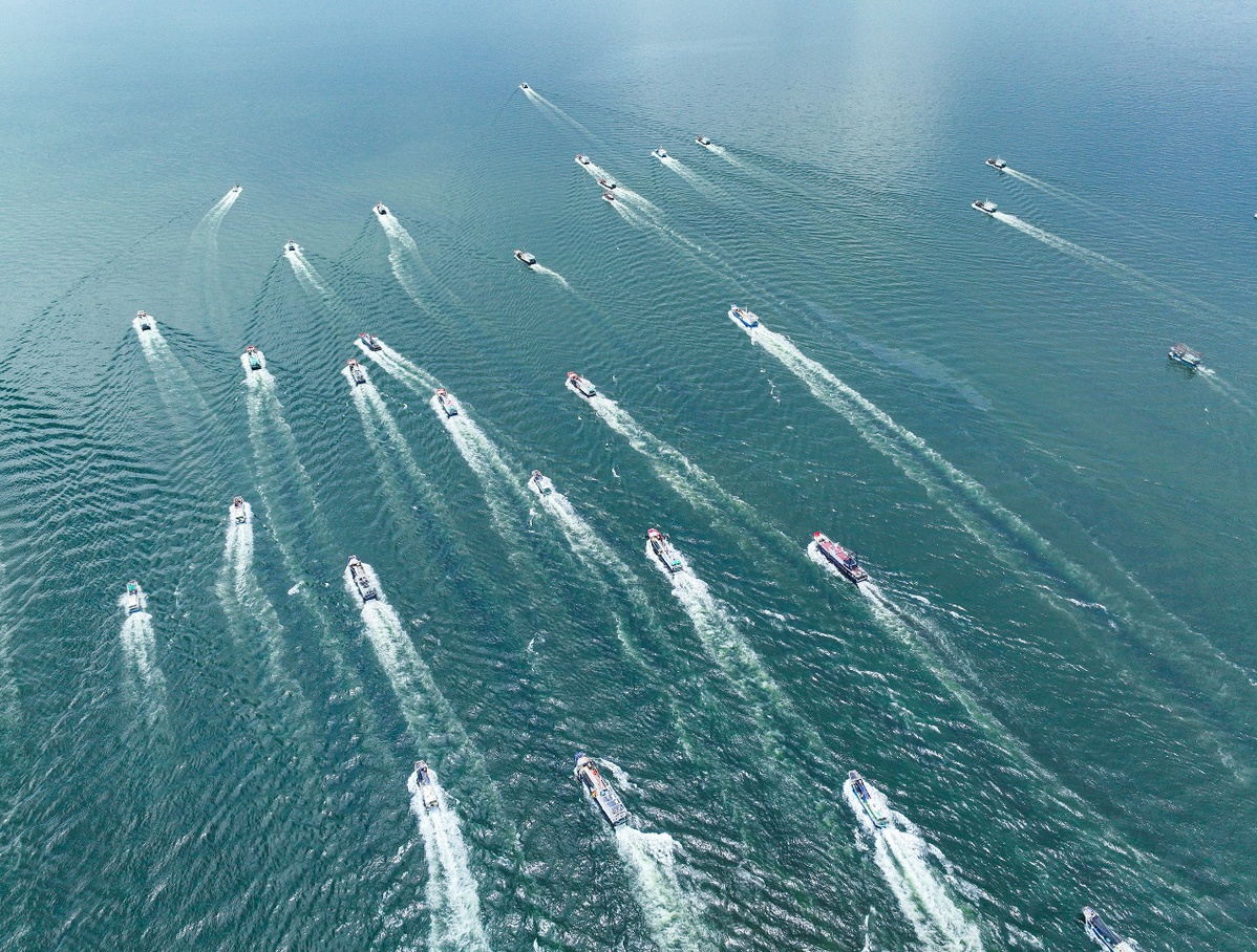 8月16日,停泊在廣東省陽江市海陵島閘坡漁港的漁船駛向大海(無人機照片)。 陽江日報 梁文棟 攝