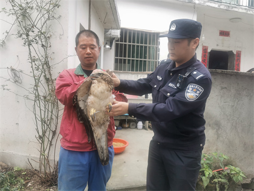 近日,休寧縣公安局流口派出所接到村民報(bào)警:鶴城鄉(xiāng)新安源村李家組村民辛嬌嬌雞圈內(nèi)闖入一只不知名的飛禽……流口派出所民警立即驅(qū)車趕赴現(xiàn)場(chǎng),發(fā)現(xiàn)是只蒼鷹因盜食家雞被困雞棚。民警與村民小心翼翼將蒼鷹抓捕出來及時(shí)放歸自然。
