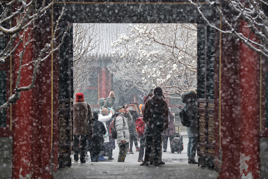 頤和園樂(lè)壽堂前的玉蘭在雪中盛放,吸引游人拍攝。(中國(guó)日?qǐng)?bào)記者 姜東 攝)