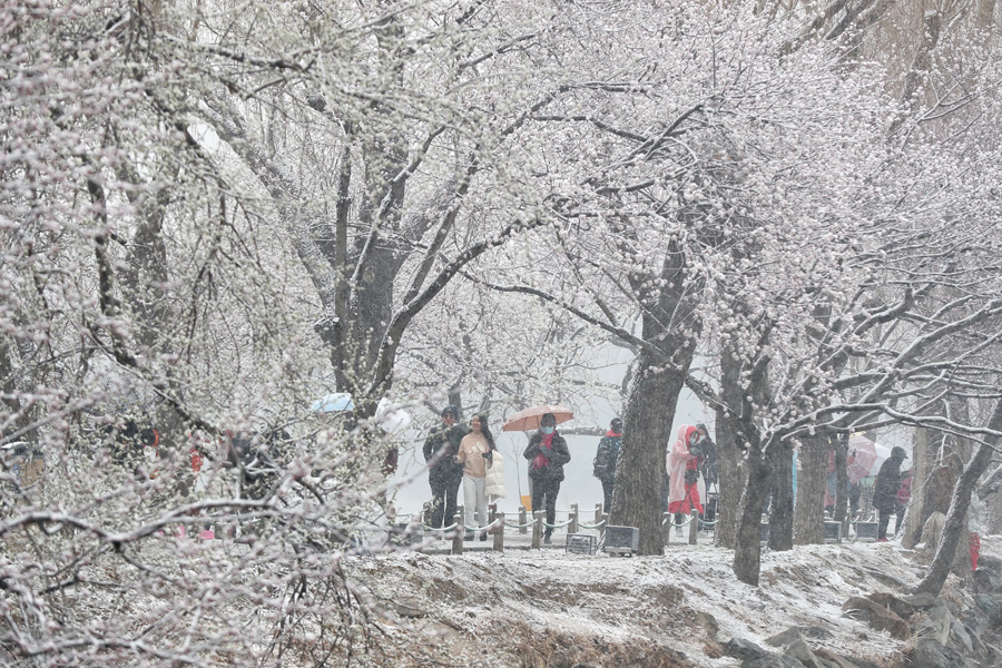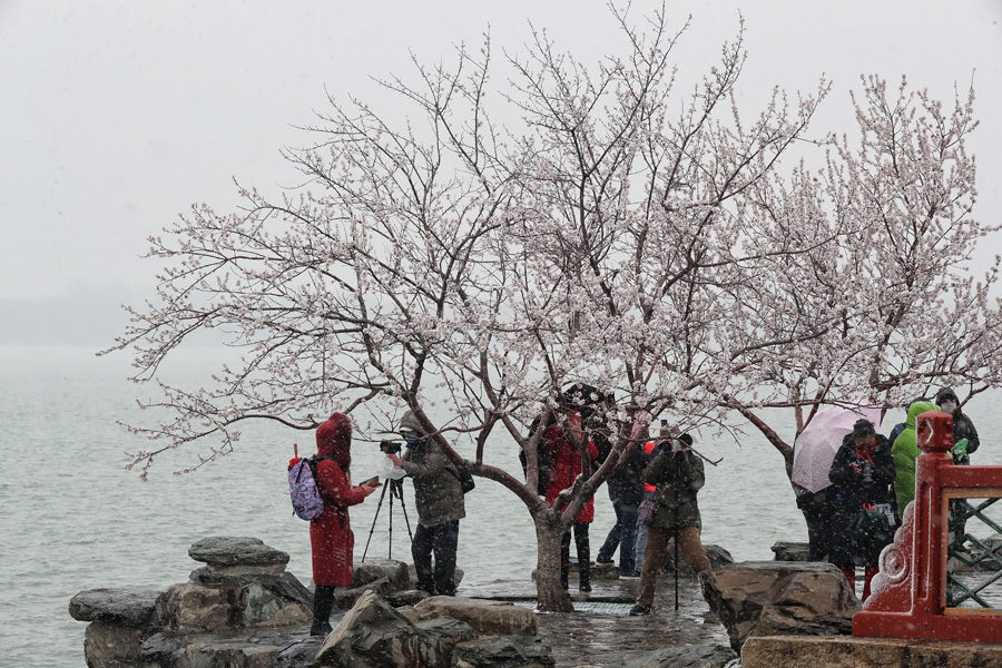 頤和園西堤的山桃花在雪中盛放,游客冒雪賞花。(中國(guó)日?qǐng)?bào)記者 姜東 攝)