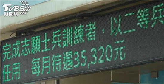 報道說,臺軍方為了募兵推出了不錯的薪資條件,在臺軍方的人才招募中心外,跑馬燈還不斷閃著“完成志愿士兵訓練者,以二等兵任用,每個月薪水超過35320元(新臺幣,約合人民幣7943元),士官的話則有41000多元新臺幣(約合人民幣9200多元)”等宣傳標語。