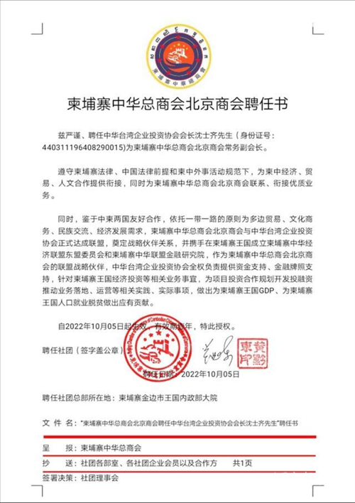 紅色十月,舉國歡慶,七十三華誕,二十大將開,喜事盈門。10月5日,中華臺灣企業(yè)投資協(xié)會會長沈士齊先生收到柬埔寨中華總商會北京商會常務(wù)副會長聘任書,又增添一新職務(wù)。