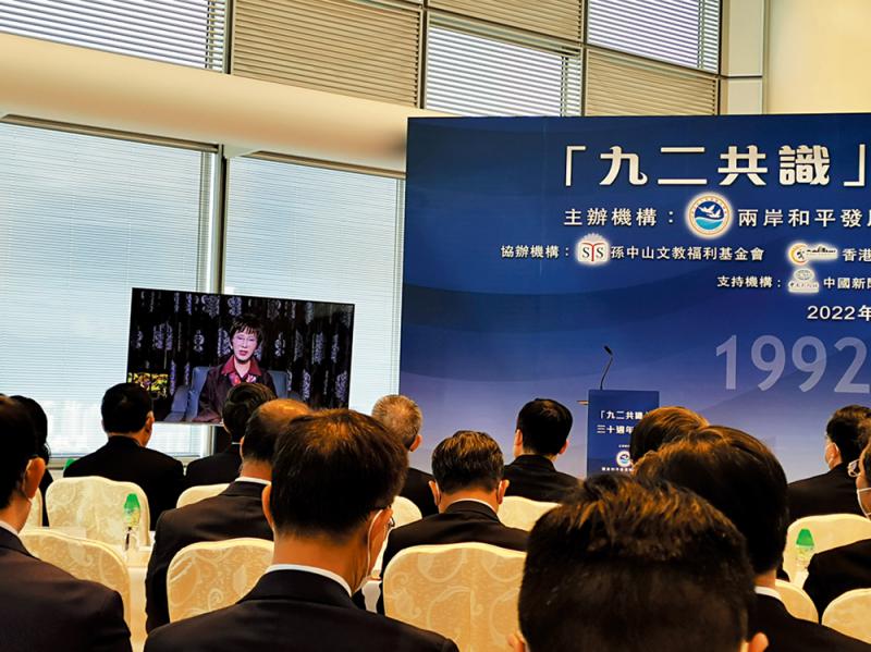 圖:中國國民黨前主席洪秀柱在視頻致辭中表示,“九二共識”是確保兩岸關系和平發(fā)展的關鍵。