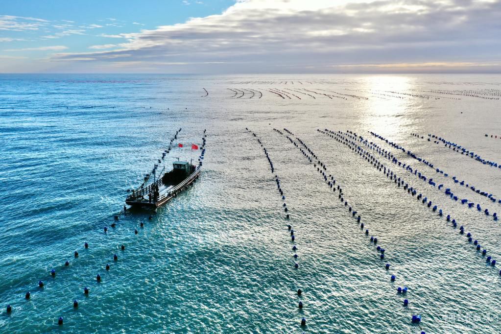 臨近傍晚,夕陽西下,晚霞滿天,海面上一艘艘返程的漁船穿行游弋在海洋牧場,泛起道道金光,沿海觀光大道上游客紛紛舉起手中的相機和手機,拍下這迷人的大海漁耕圖。