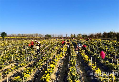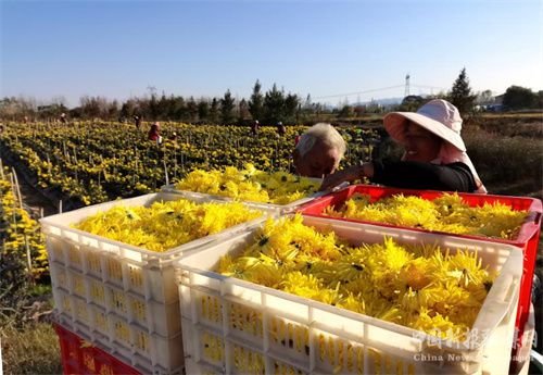 2022年11月6日,湯池鎮(zhèn)中份村金菊花園家庭農(nóng)場(chǎng)200畝金絲皇菊長(zhǎng)勢(shì)喜人,村里的黨員志愿者和村民們一起,正抓緊秋冬晴好天氣采摘、加工、上市。