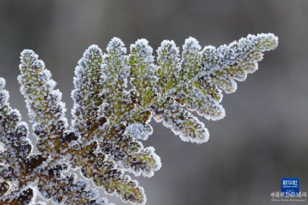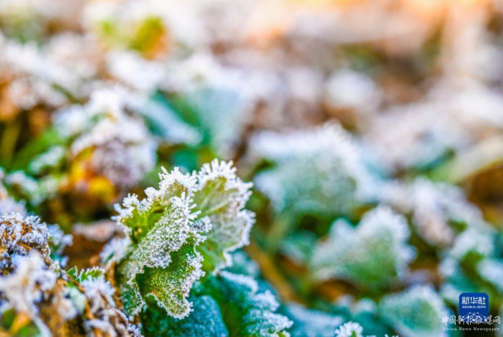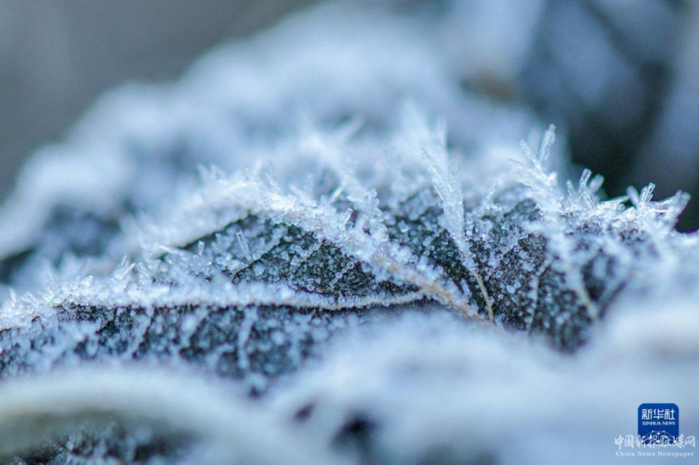 11月17日,在山東省淄博市高青縣,植物葉子上凝結(jié)了一層晨霜。