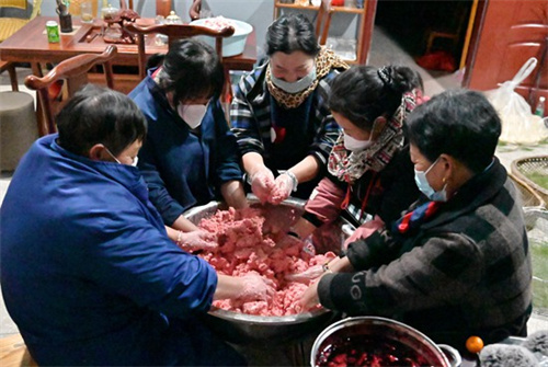 12月19日,湖南省隆回縣金石橋鎮(zhèn)黃金井村婦女在加工制作豬血丸子。進入冬季以來,該縣北部山區(qū)農(nóng)民,采用傳統(tǒng)手工藝用柴火熏制豬血丸子,通過線上線下銷往全國各地,已逐漸成為全國各大城市餐桌上的特色美味佳肴,助力鄉(xiāng)村產(chǎn)業(yè)振興。(賀上升攝)