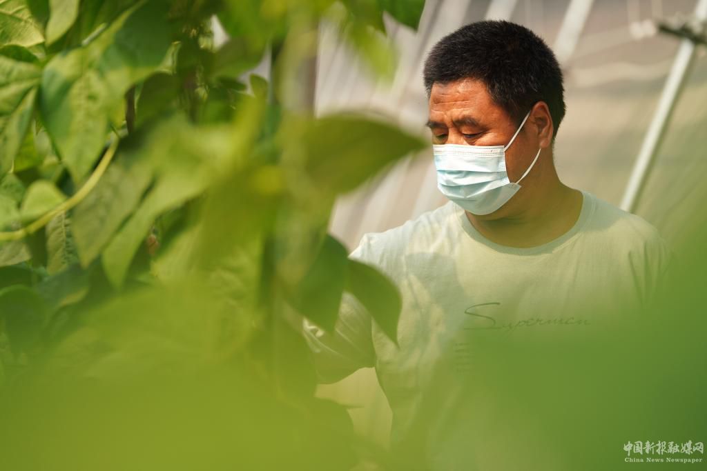 4月19日,孫思川正在查看紫色油豆角生長情況。(新華社記者王建威 攝)