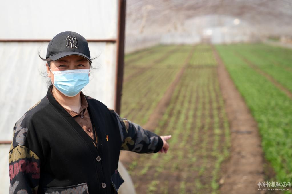 4月19日,唐艷麗在一個大棚前。(新華社記者王建威 攝)