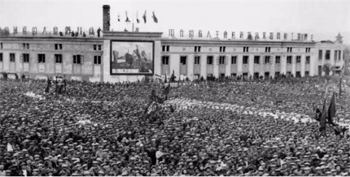 1950年5月,遼寧撫順工人階級與各界人民群眾70000余人,在紀念“五一”國際勞動節(jié)、“五四”青年節(jié)大會上,表示做好工作、安全生產(chǎn)。
