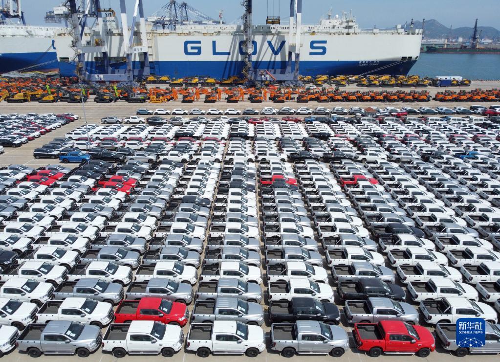 大批出口商品車在山東港口煙臺港集結(jié)等待裝船(5月9日攝,無人機照片)。