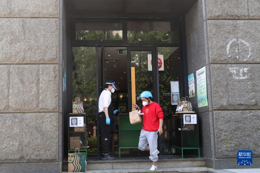 5月17日,外賣小哥在位于上海市徐匯區(qū)的一家咖啡店外領(lǐng)取網(wǎng)絡(luò)訂單貨品準(zhǔn)備派送。