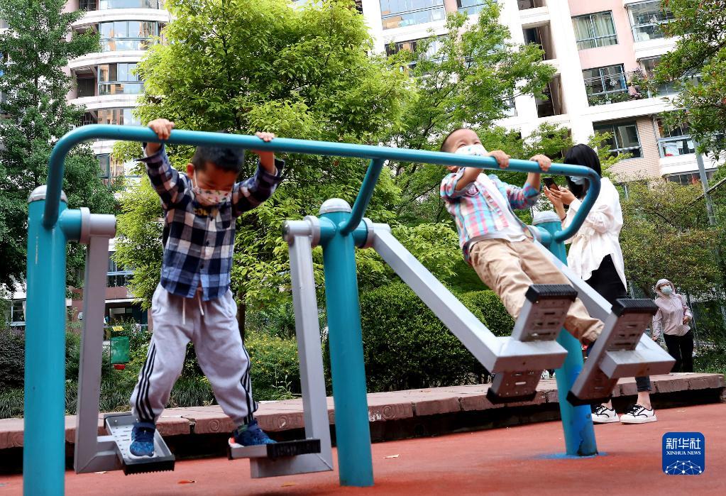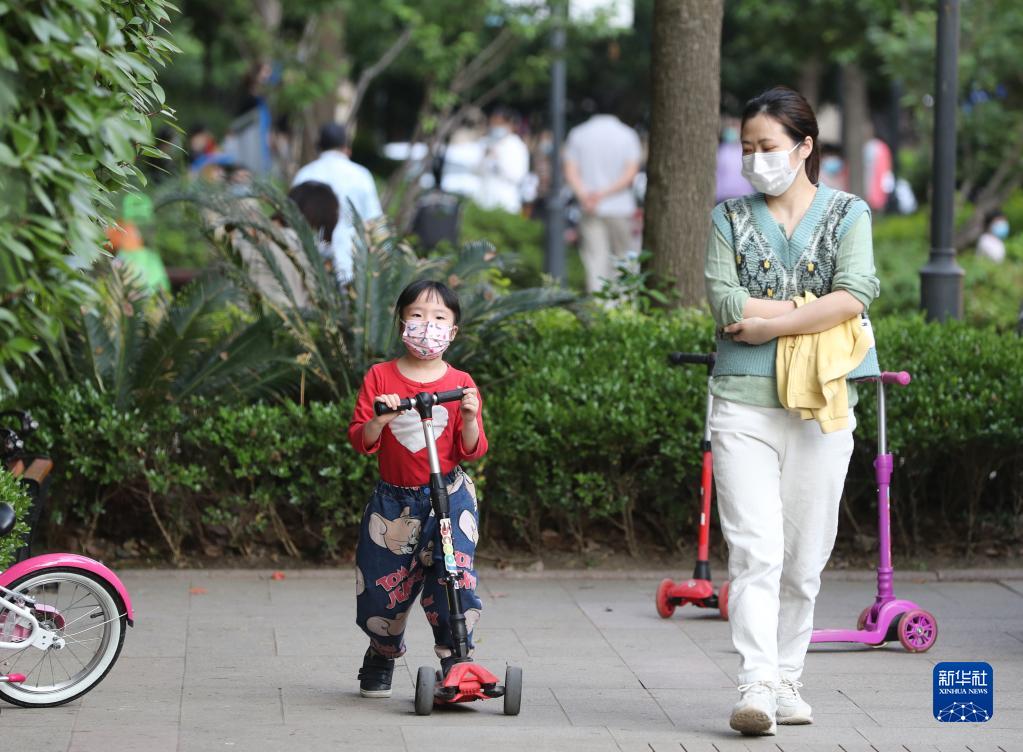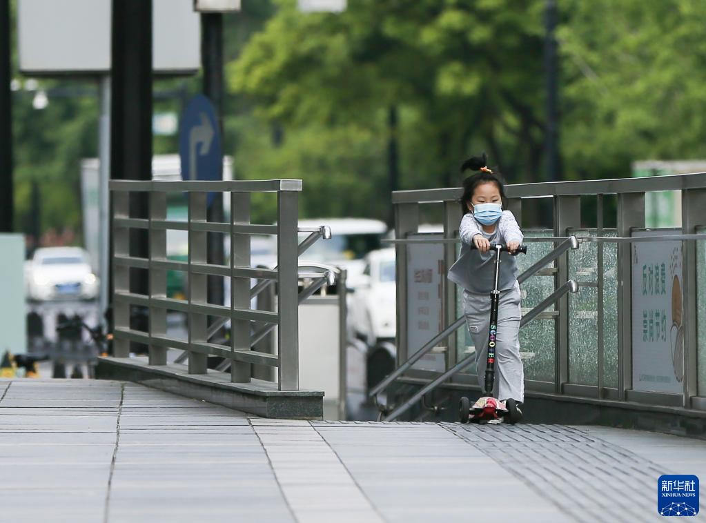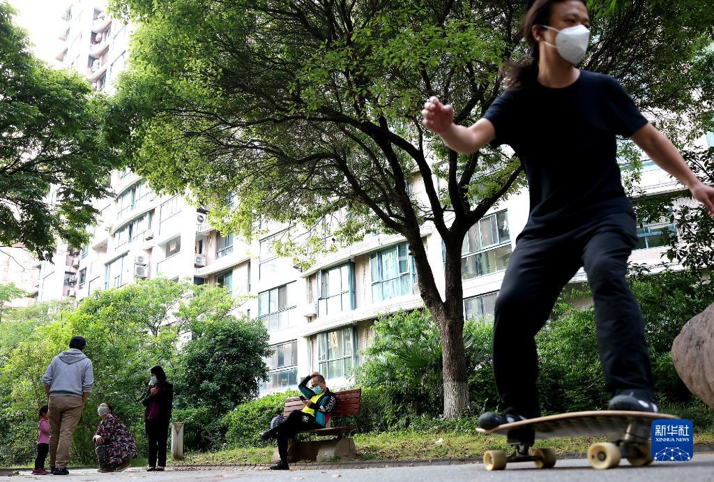 5月17日,市民在上海市普陀區(qū)的一個(gè)居民小區(qū)內(nèi)進(jìn)行戶外活動(dòng)。