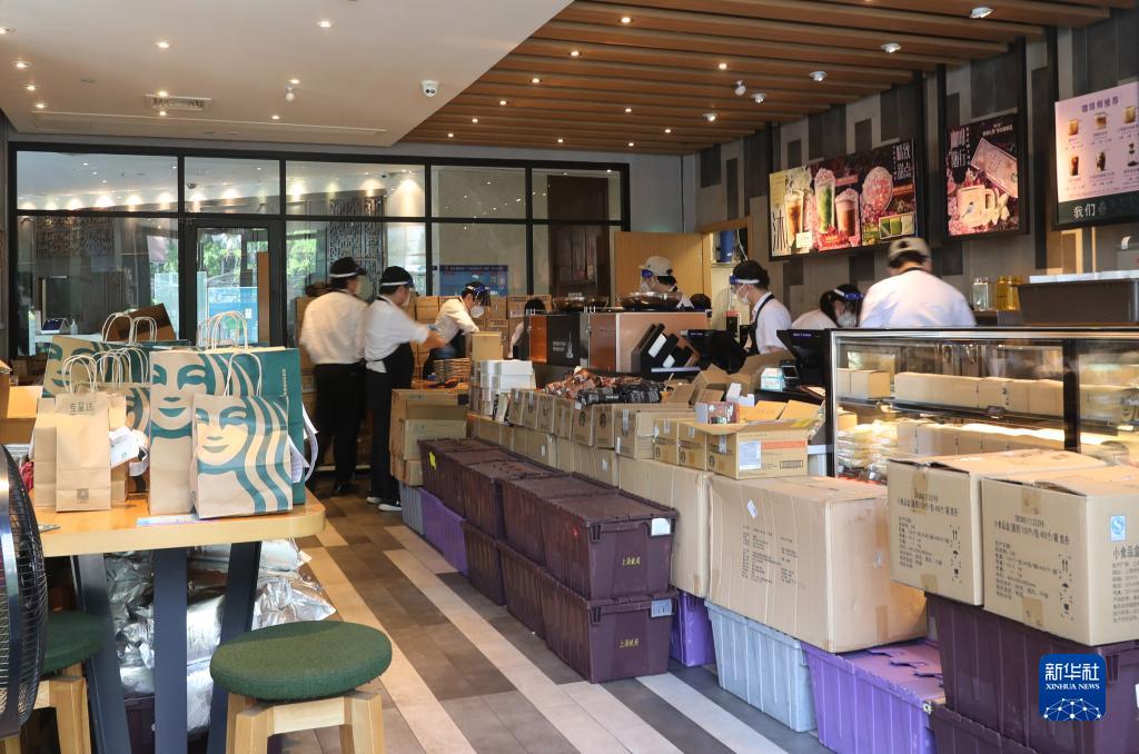 5月17日,位于上海市徐匯區(qū)一家咖啡店的工作人員在制作網(wǎng)絡(luò)訂單貨品。