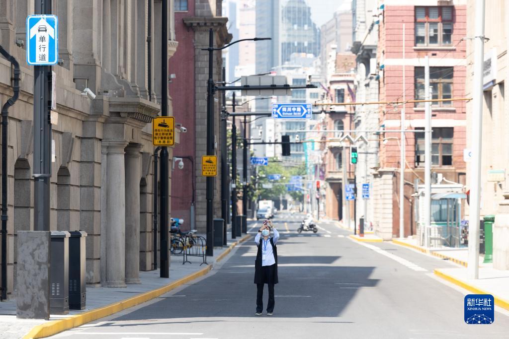 5月17日,在上海外灘附近,一名市民在拍攝街景。