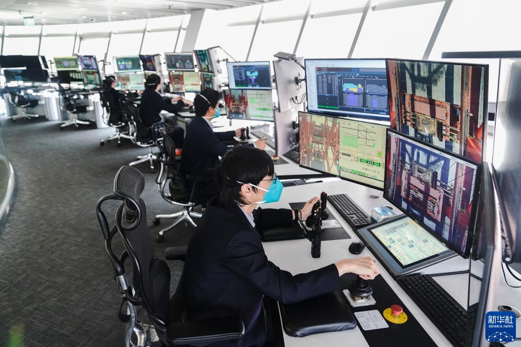 5月17日,在上海洋山深水港四期自動(dòng)化碼頭港區(qū)內(nèi),工作人員在遠(yuǎn)程操控平臺(tái)上作業(yè)。