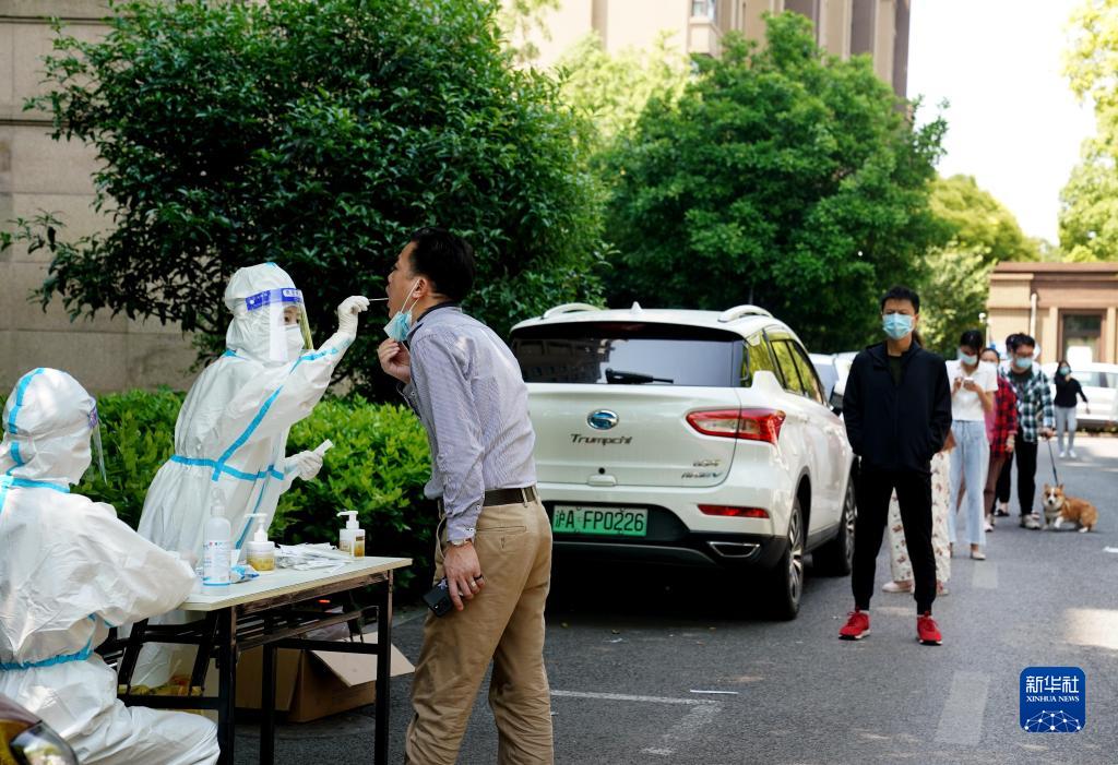 5月17日,在上海市松江區(qū)一個(gè)被列為防范區(qū)的小區(qū)內(nèi),居民們?cè)趨⒓雍怂岷Y查。