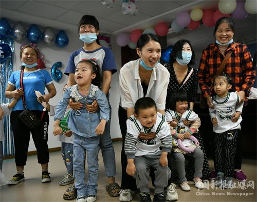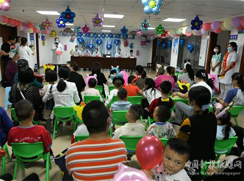 2022年6月1日,在凱里市中醫(yī)醫(yī)院康復(fù)科,醫(yī)護(hù)人員、家長(zhǎng)與孩子們歡度“六一”。(楊仁海 攝)
