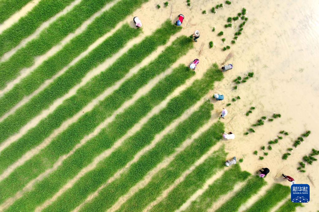 6月7日,村民在貴州省黔東南苗族侗族自治州岑鞏縣大有鎮(zhèn)臘恰畈村整理秧苗(無人機(jī)照片)。