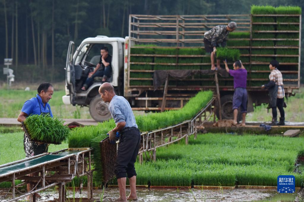 6月7日,浙江省武義縣王宅鎮(zhèn)仁村育秧工廠為農(nóng)戶裝車運(yùn)送水稻秧苗。