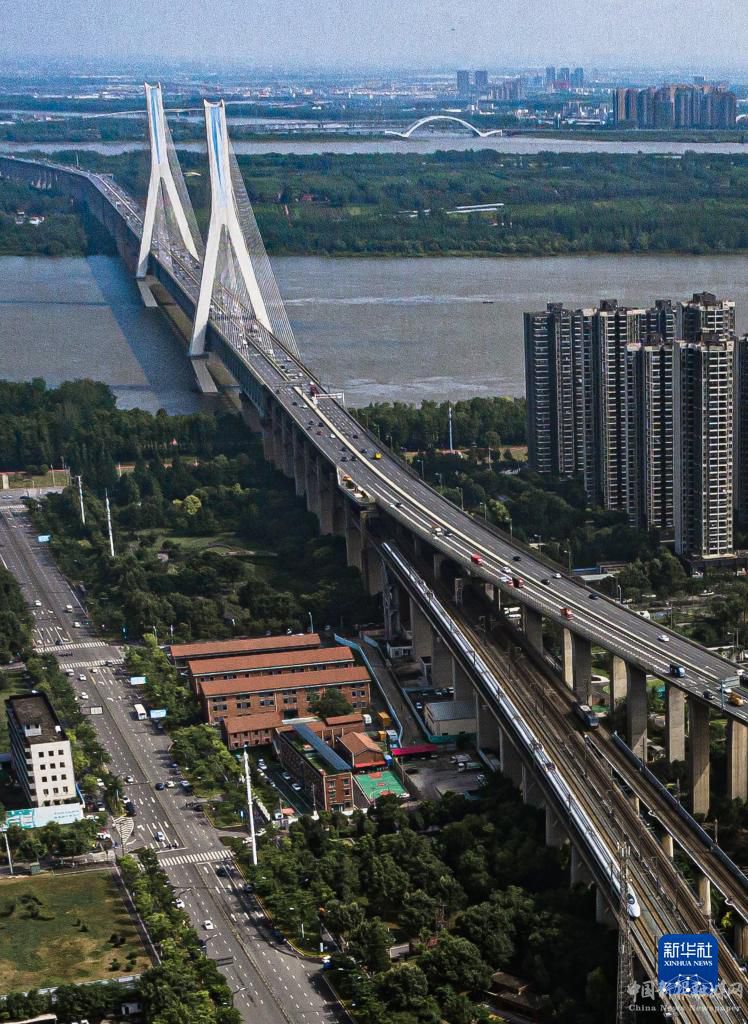 6月20日,一列動車組列車在京廣高鐵京武段武漢站附近行駛(無人機照片)?!⌒氯A社記者 肖藝九 攝