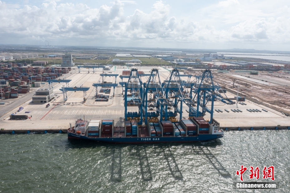 6月27日,來(lái)自印尼雅加達(dá)的“海豐虎山”輪第一根纜繩系在廣西北部灣港欽州自動(dòng)化集裝箱碼頭纜樁上,這標(biāo)志著中國(guó)首個(gè)海鐵聯(lián)運(yùn)自動(dòng)化集裝箱碼頭首次靠泊成功。港口一期項(xiàng)目建設(shè)2個(gè)10萬(wàn)噸級(jí)泊位。碼頭鏈接鐵路中心站后,即可實(shí)現(xiàn)海鐵聯(lián)運(yùn)。圖為“海豐虎山”輪靠泊在廣西北部灣港欽州自動(dòng)化集裝箱碼頭。(無(wú)人機(jī)照片)   中新社記者 王偉臣 攝