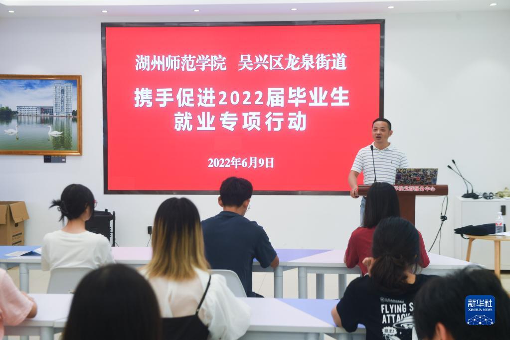 浙江省湖州市吳興區(qū)龍泉街道工作人員應邀為湖州師范學院2022屆畢業(yè)生詳細介紹就業(yè)創(chuàng)業(yè)的相關政策,為畢業(yè)生答疑解惑(2022年6月9日攝)。新華社記者 徐昱 攝