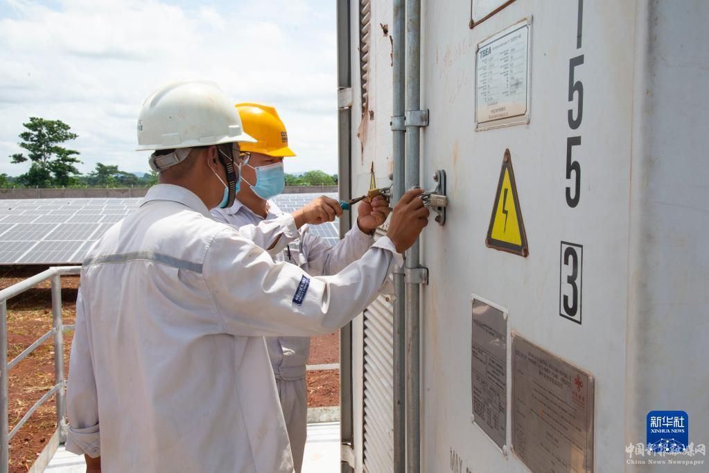 6月2日,在中非共和國(guó)首都班吉附近的賓博市,工程師在薩卡伊光伏電站檢修設(shè)備。新華社記者羅毓攝