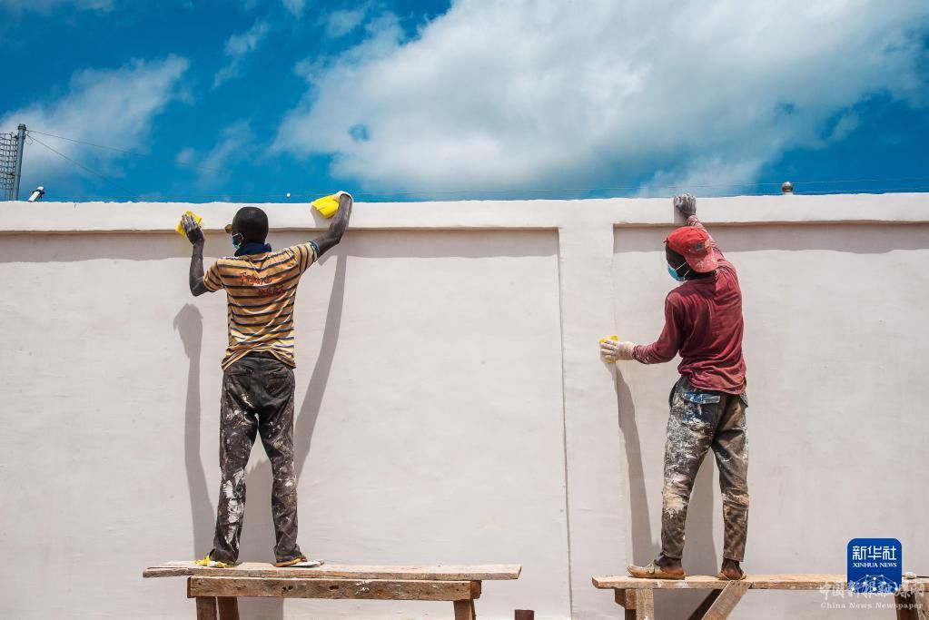 6月2日,在中非共和國(guó)首都班吉附近的賓博市,薩卡伊光伏電站的當(dāng)?shù)貑T工在粉刷墻壁。新華社記者羅毓攝