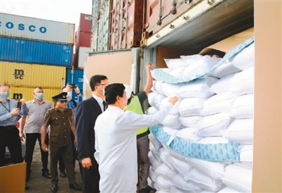 6月28日,中國緊急援助斯里蘭卡的一批糧食運抵科倫坡國際集裝箱碼頭。