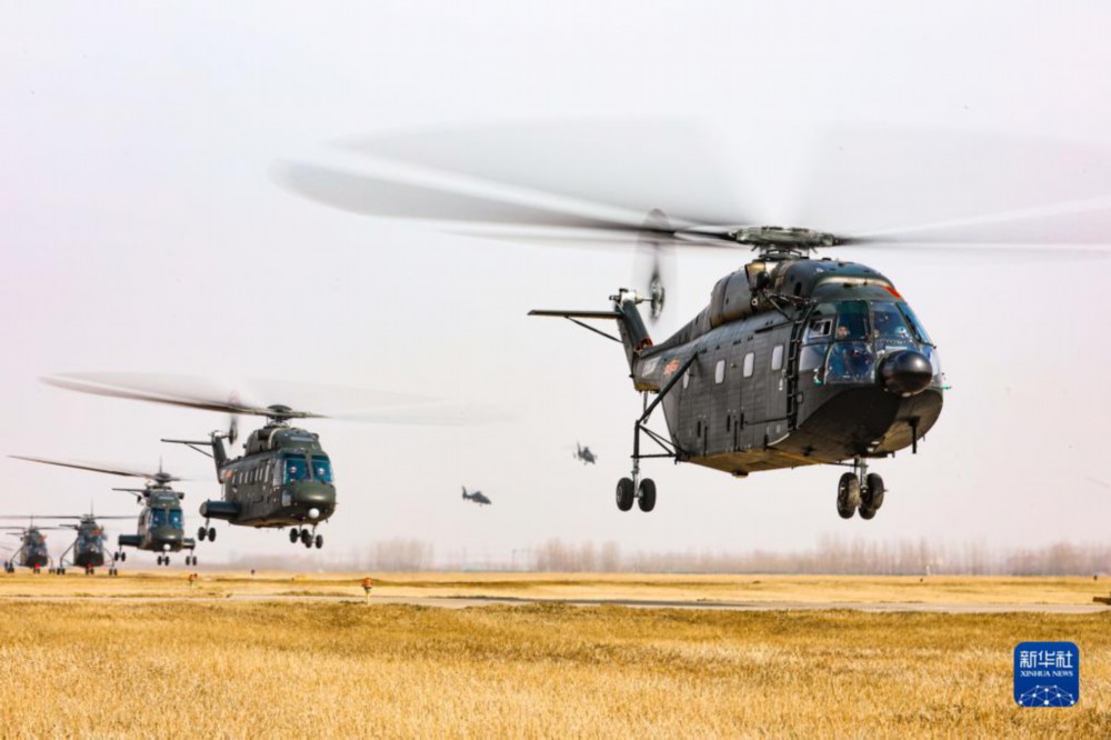 北部戰(zhàn)區(qū)陸軍第80集團軍某陸航旅攻擊直升機與運輸直升機組成大機群編隊進行跨晝夜飛行訓練(2022年2月11日攝)。新華社發(fā)(劉雨辰 攝)