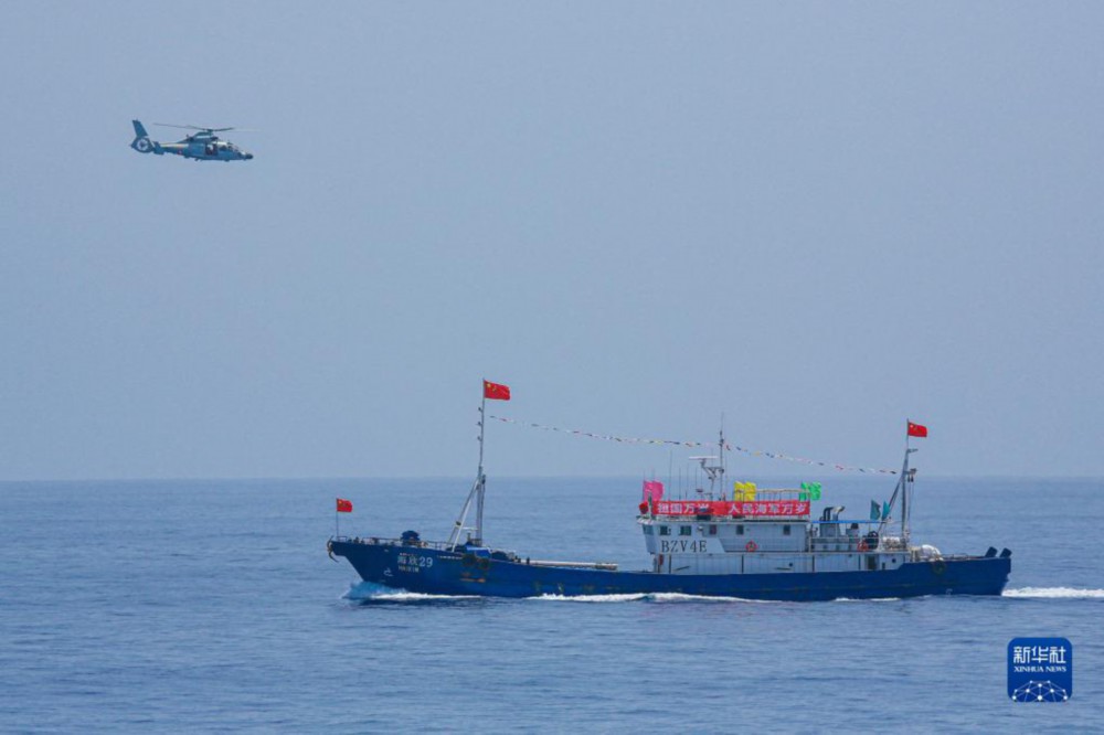 中國海軍第40批護航編隊中的艦載直升機在被護船只周邊海域巡邏警戒(2022年6月4日攝)。新華社發(fā)(唐文 攝)