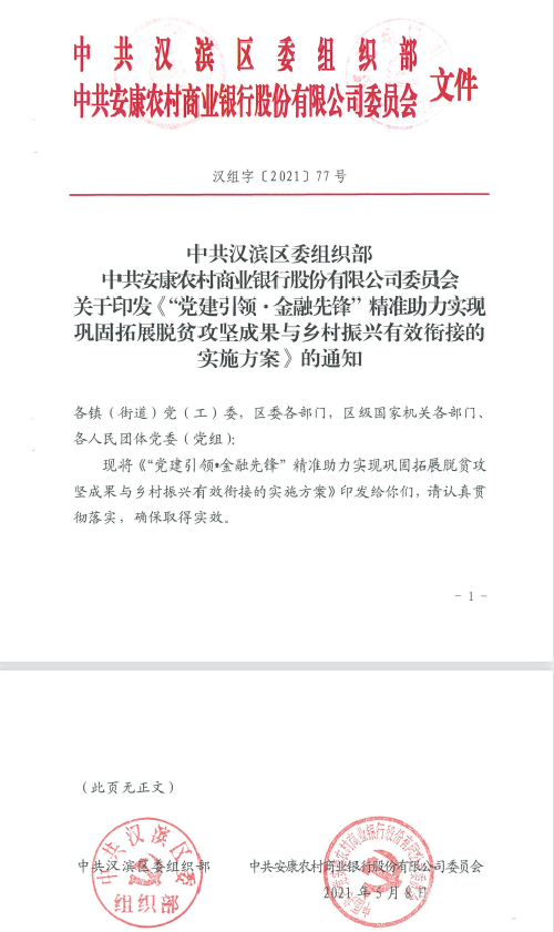 黨建業(yè)務深度融合,賡續(xù)紅色金融血脈。安康農(nóng)商銀行與轄區(qū)所有鎮(zhèn)辦聯(lián)合召開了“黨建引領•金融先鋒”精準助力鄉(xiāng)村振興工作部署會,與525個村(社區(qū))建立“黨建+金融”服務新模式,完成了3個季度金融協(xié)理員考核工作。形成了各區(qū)組織部門牽頭、農(nóng)商銀行具體落實、村級組織協(xié)調推進的組織體系,開啟了黨建與業(yè)務互相促進、優(yōu)勢互補、共同提高的工作新格局,有力鞏固了我行農(nóng)村金融陣地。