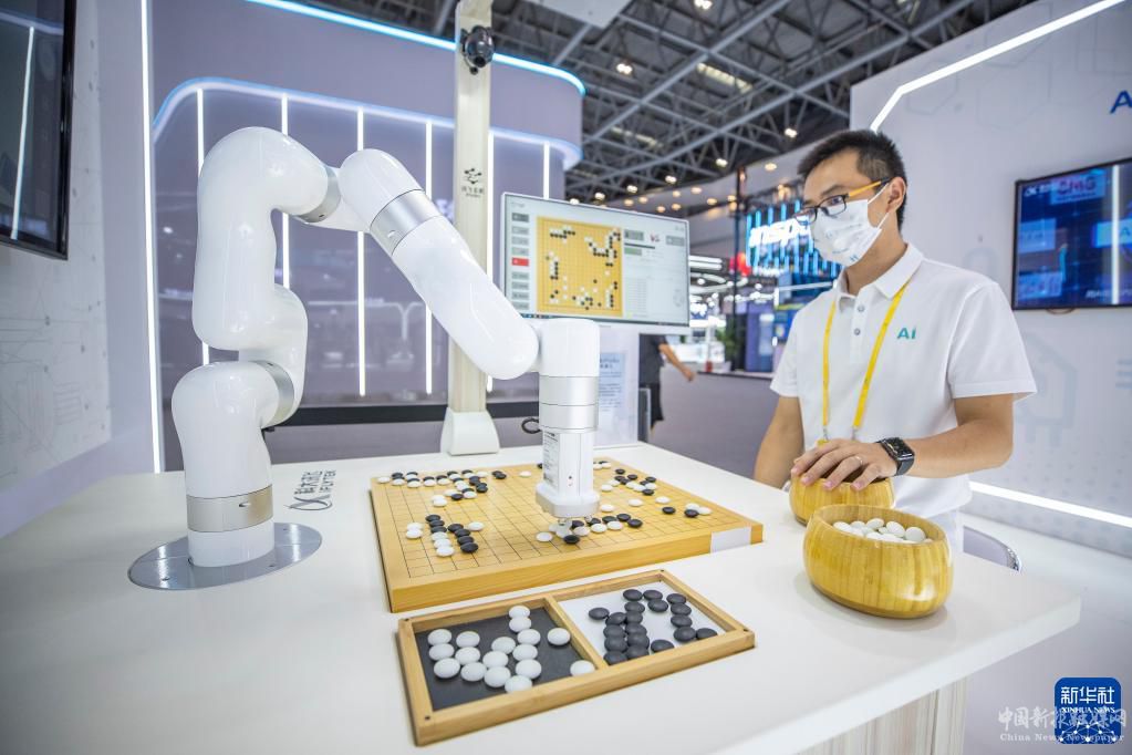 8月21日,2022智博會科大訊飛展廳的工作人員演示與弈棋機器人對弈。