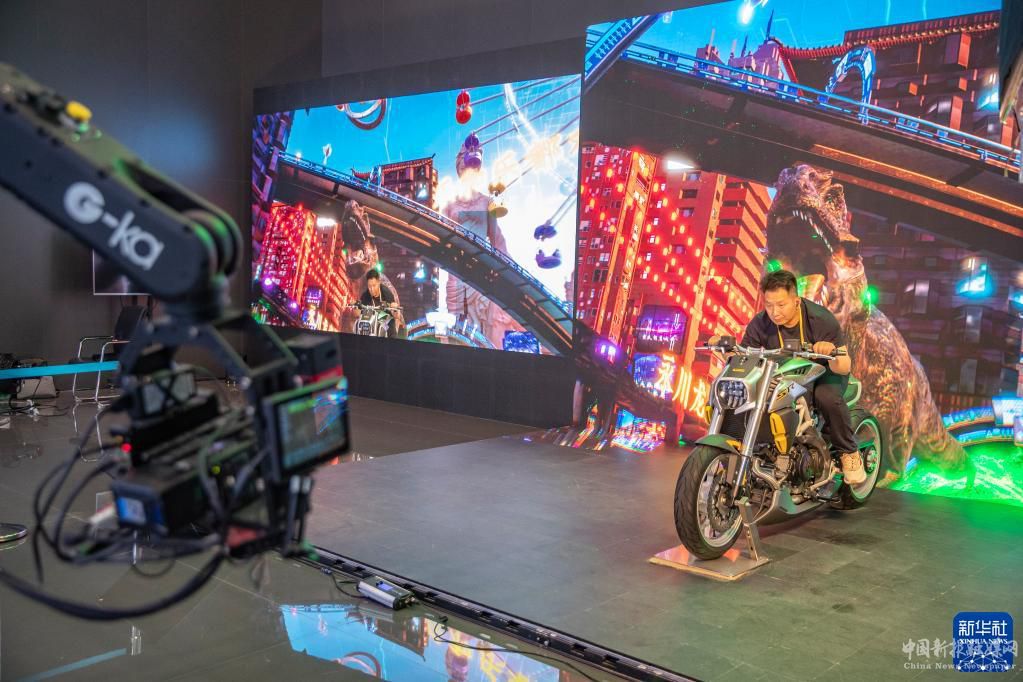 8月21日,在2022智博會重慶展館內(nèi),工作人員在演示XR擴展現(xiàn)實拍攝技術(shù)。