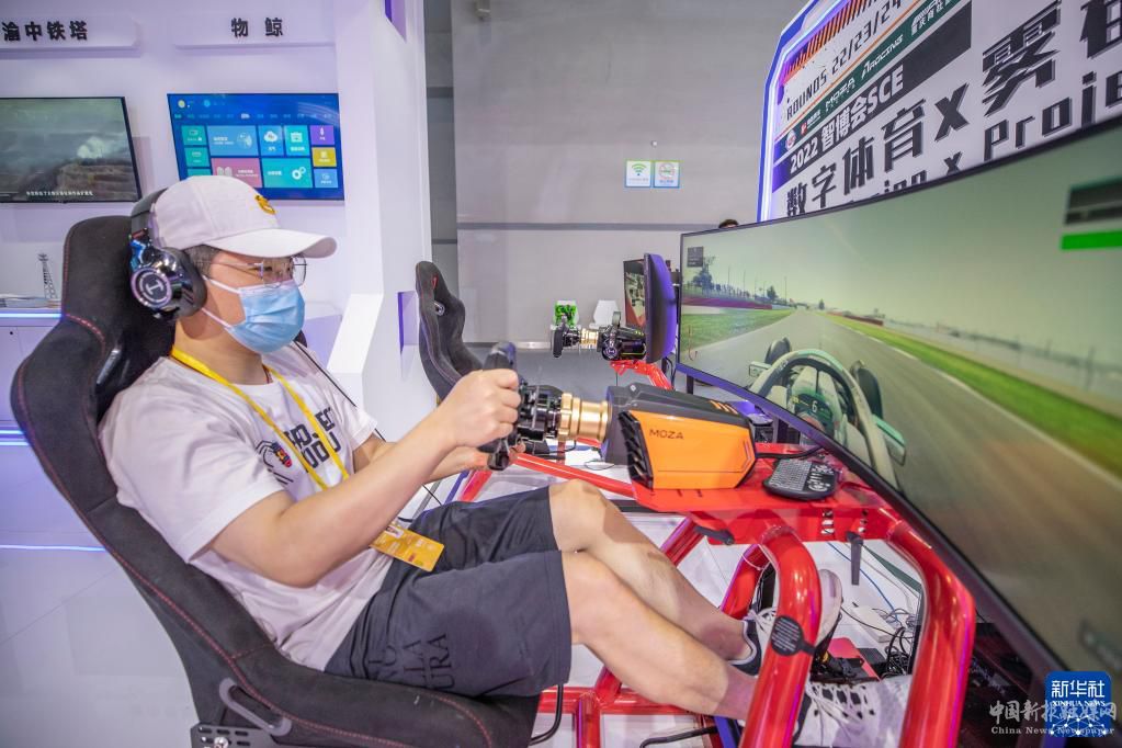 8月21日,工作人員在2022智博會重慶渝中展廳內(nèi)演示F1電競模擬器。