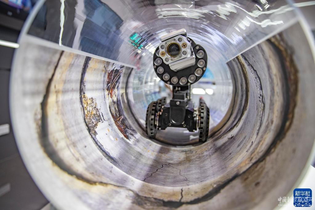這是8月21日在2022智博會中央大廳重慶展館內(nèi)拍攝的非開挖管道檢測機器人。