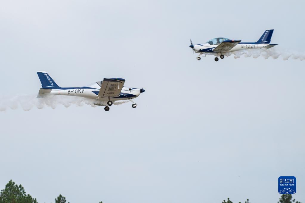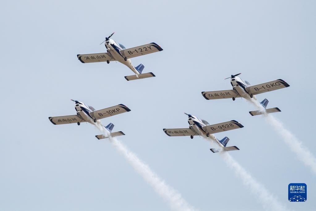9月1日,在湖南株洲蘆淞機場,飛行員進行固定翼編隊飛行表演。