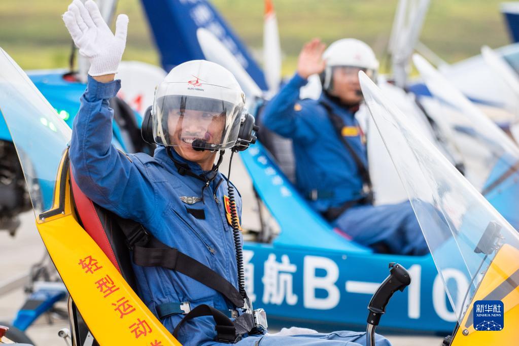 9月1日,在湖南株洲蘆淞機場,旋翼機飛行員在表演結(jié)束后向觀眾示意。