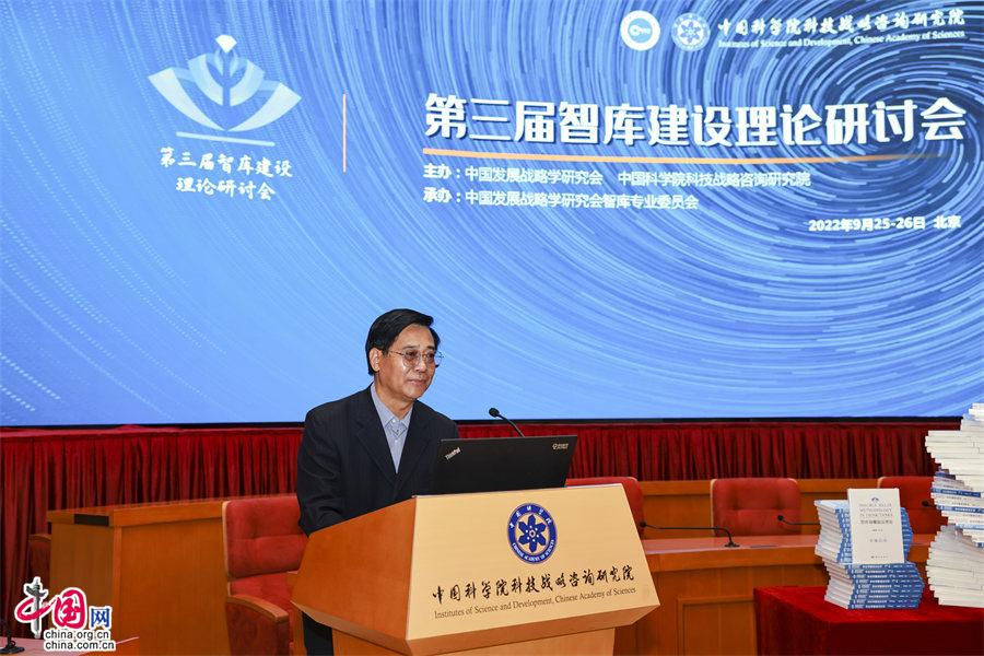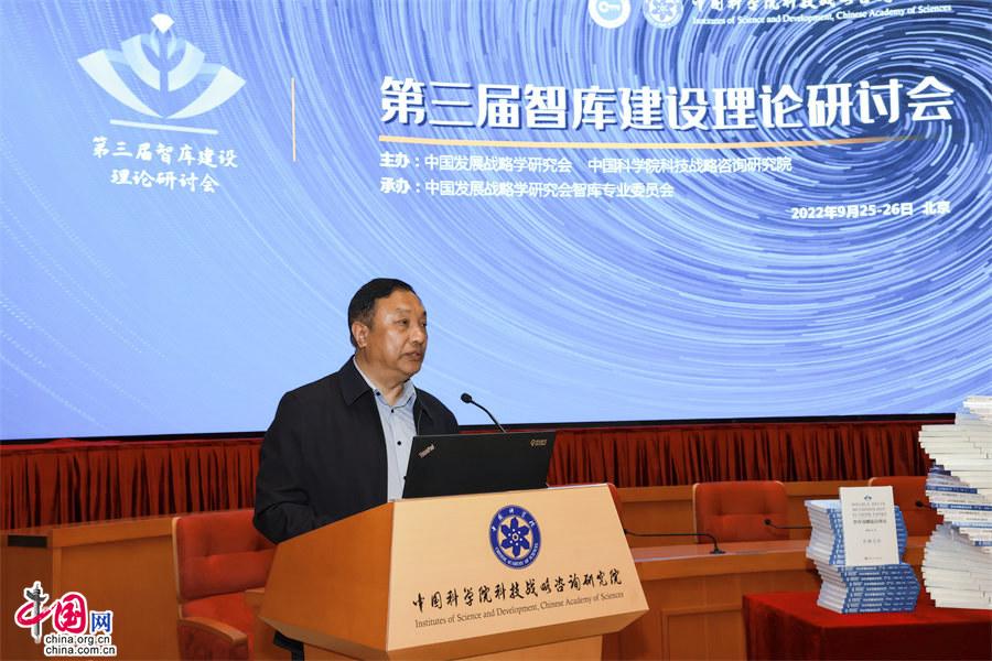 中國網(wǎng)/中國發(fā)展門戶網(wǎng)訊  (記者王振紅)9月25日,由中國發(fā)展戰(zhàn)略學(xué)研究會與中國科學(xué)院科技戰(zhàn)略咨詢研究院(以下簡稱戰(zhàn)略咨詢院)共同主辦,中國發(fā)展戰(zhàn)略學(xué)研究會智庫專業(yè)委員會(以下簡稱智庫專委會)承辦的第三屆智庫建設(shè)理論研討會在京舉行,會期二天。會議由主論壇、專題論壇和閉門會等組成,會上發(fā)布了戰(zhàn)略咨詢院最新智庫理論研究成果《智庫雙螺旋法理論》《智庫雙螺旋法應(yīng)用》(一、二)三部著作。