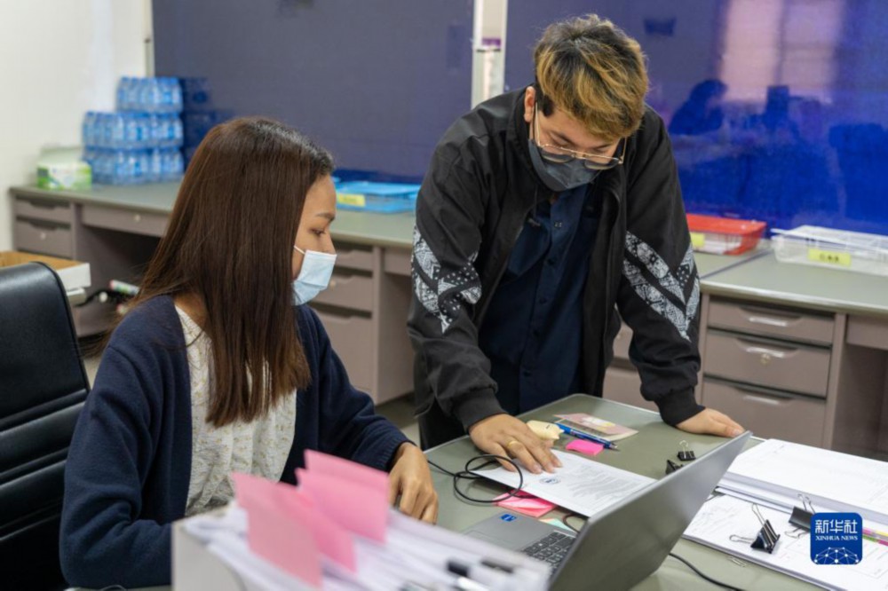 9月7日,在泰國(guó)呵叻,中泰鐵路項(xiàng)目部監(jiān)理總站專職翻譯南塔蓬(右)與同事討論工作。新華社記者 林昊 攝
