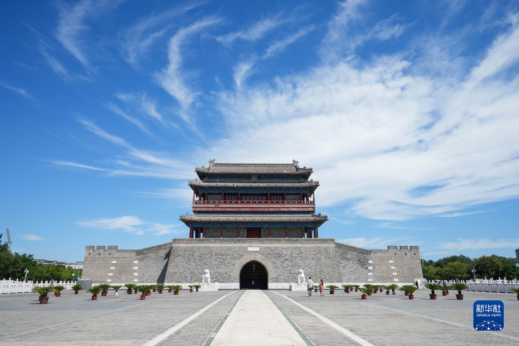 2022年8月16日,游客在位于北京中軸線上的永定門城樓前參觀游覽。 新華社記者 鞠煥宗 攝
