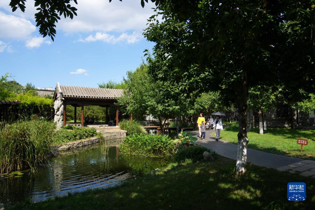 2022年8月16日,人們?cè)诒本┦袞|城區(qū)三里河參觀游覽。曾經(jīng)雜院林立的草廠三里河,如今小橋、流水、廊亭、人家,頗有水鄉(xiāng)意境。 新華社記者 鞠煥宗 攝