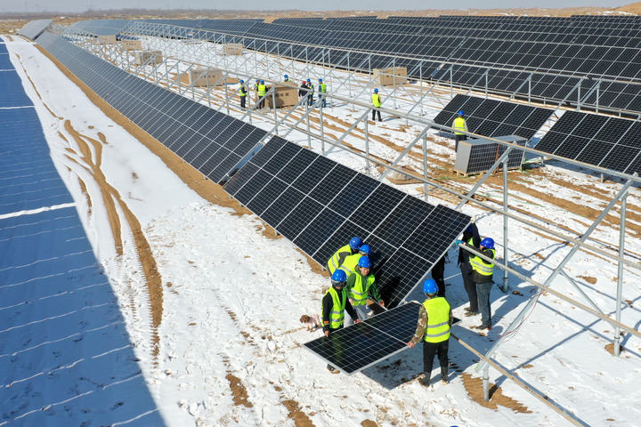 2月16日,在甘肅嘉年節(jié)能科技有限公司古浪黃花灘30萬千瓦光伏發(fā)電項(xiàng)目建設(shè)現(xiàn)場(chǎng),工人安裝光伏組件(無人機(jī)照片)。新華社記者 范培珅 攝