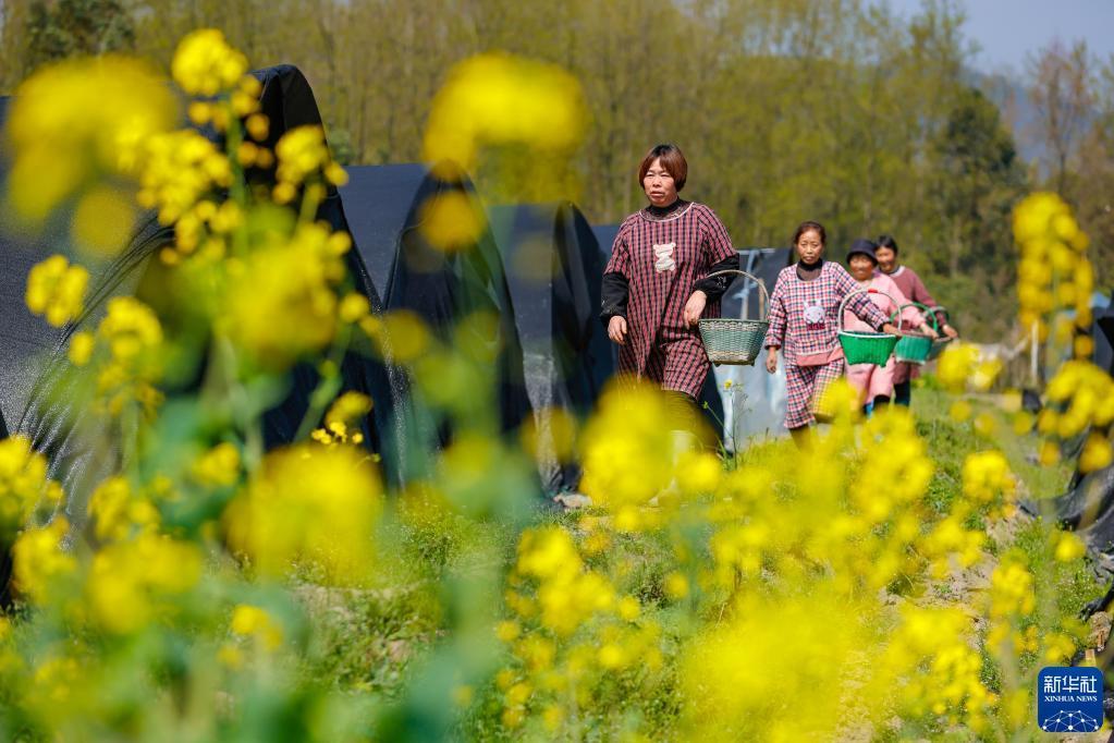 在四川省成都市大邑縣新場(chǎng)古鎮(zhèn)燈籠社區(qū),當(dāng)?shù)卮迕裥凶咴诜N植羊肚菌的大棚旁(3月8日攝)。