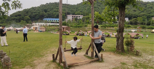 記者看到,莊園內(nèi)有許多懷舊的設(shè)施,有樹木做成的“秋千”,還有碾米的磨盤,給人“小橋流水人家”的感覺!在草坪內(nèi),有女孩們?cè)谕?ldquo;甩飛碟” 游戲,也有人在“蒙古包”內(nèi)燒烤。