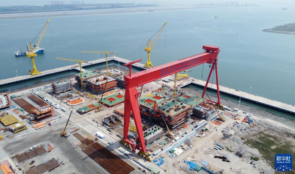 5月10日拍攝的渤中19-6凝析氣田一期開發(fā)項(xiàng)目平臺(tái)建造現(xiàn)場(chǎng)(無(wú)人機(jī)照片)。