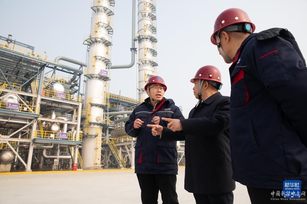 12月28日,在淮北礦業(yè)集團碳鑫科技有限公司,劉中民院士(中)和工作人員在交流裝置建設(shè)和運行情況。