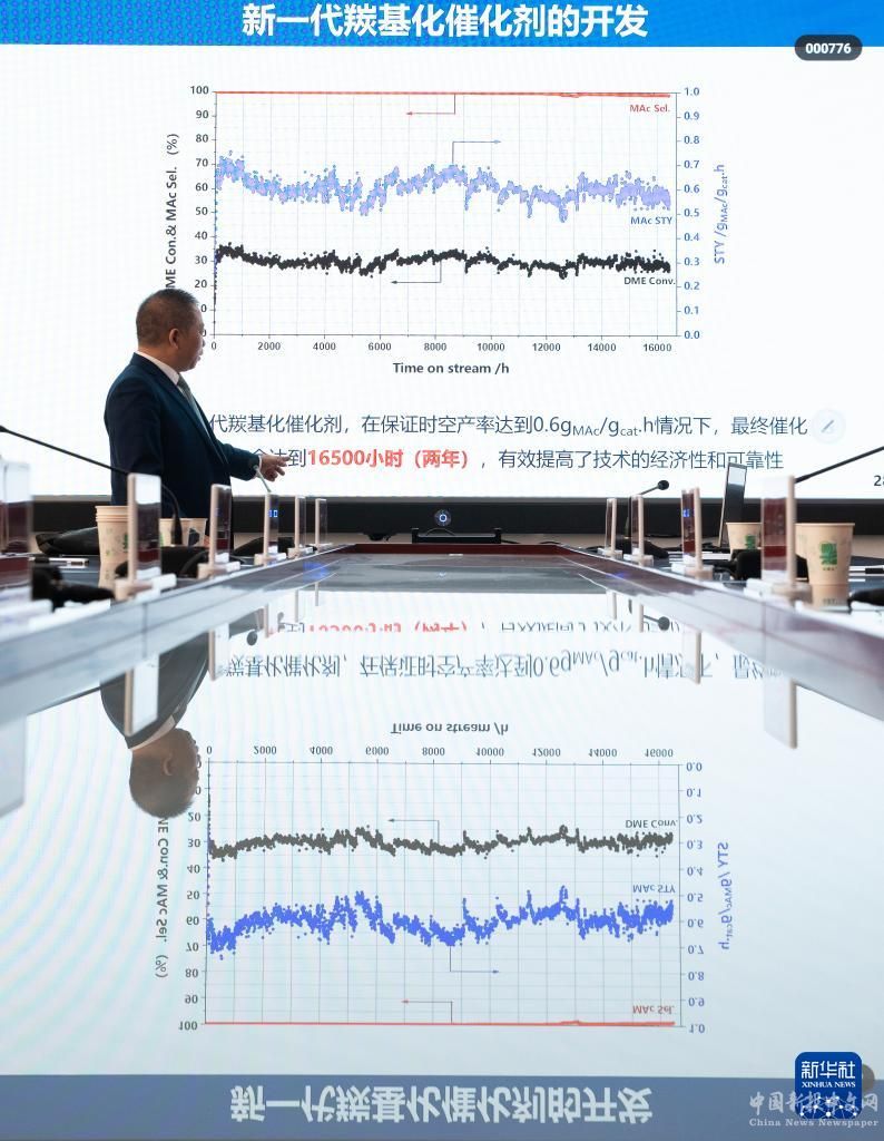 12月28日,在淮北礦業(yè)集團碳鑫科技有限公司,劉中民院士在會議室向媒體介紹升級催化劑的研究進展。