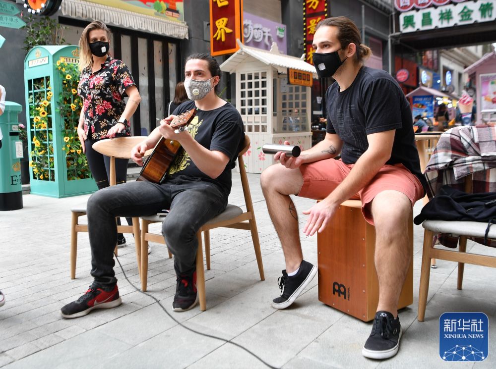 ↑2020年4月16日,一支來自巴西的樂隊在西安市未央?yún)^(qū)一處商業(yè)街區(qū)進(jìn)行戶外表演。新華社記者 張博文 攝